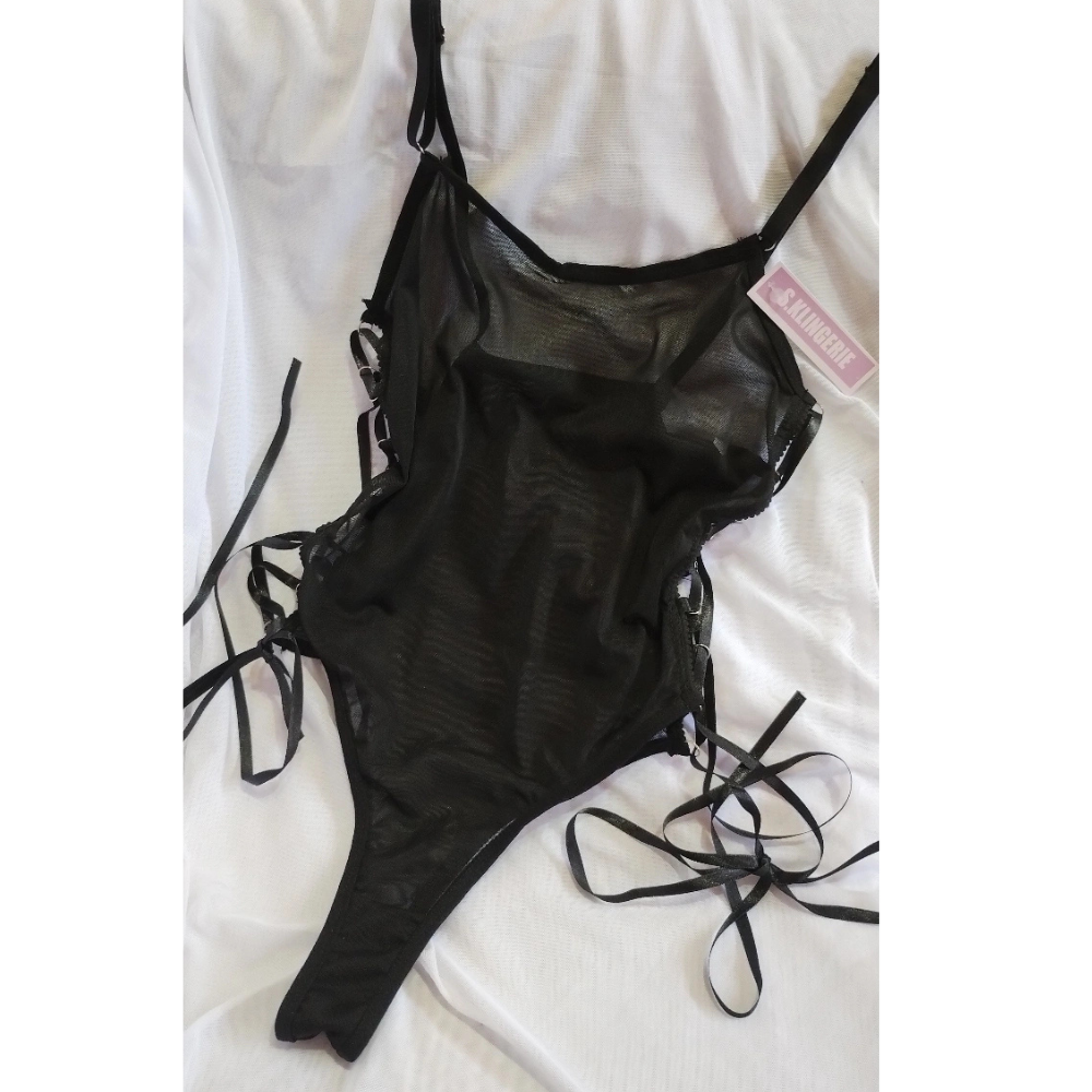 BODY em tule liso totalmente transparente, alças reguláveis e lateral em corda amarração.