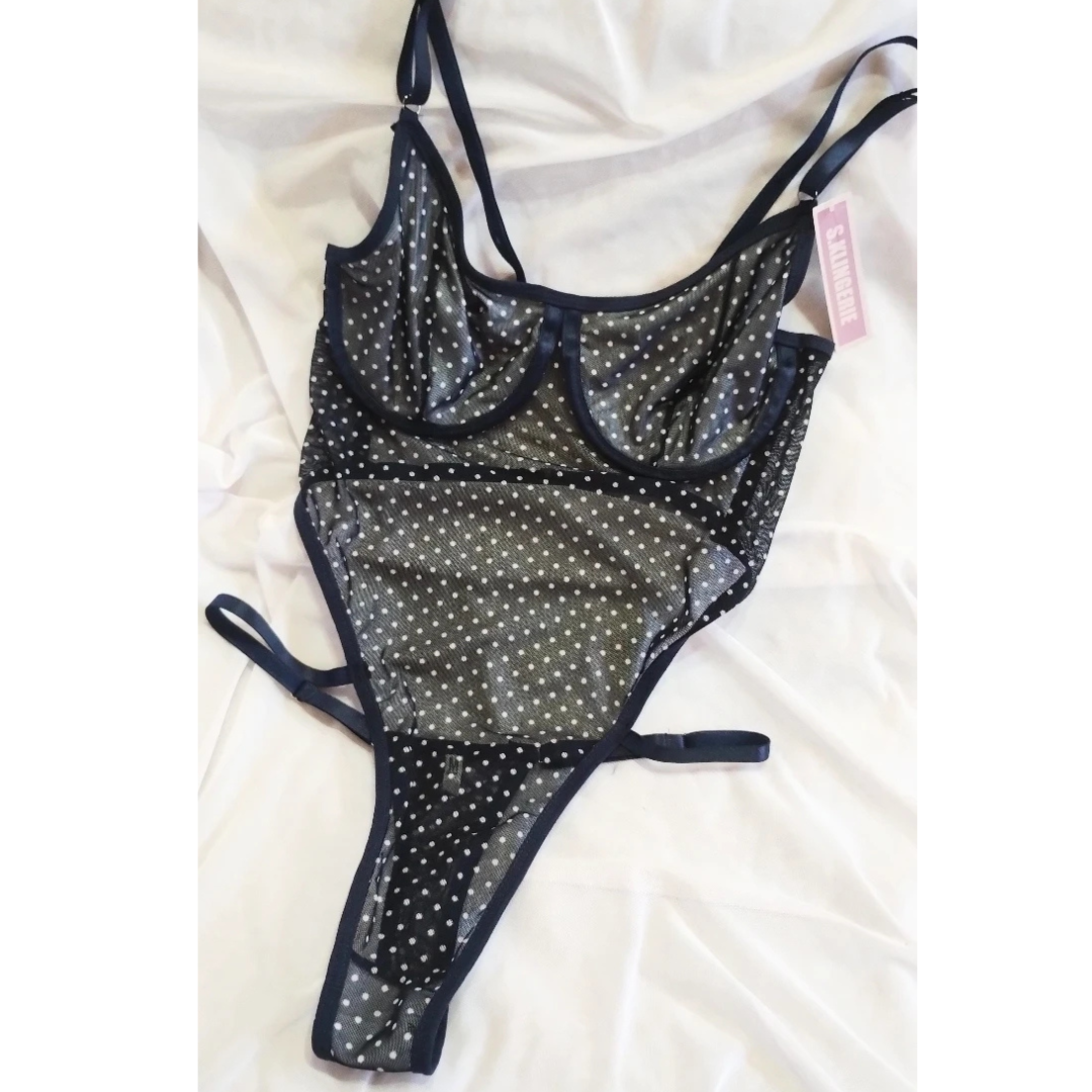 BODY em tule estampado em poá, com forro, com aro, cavado e com elásticos reguláveis nas costas.