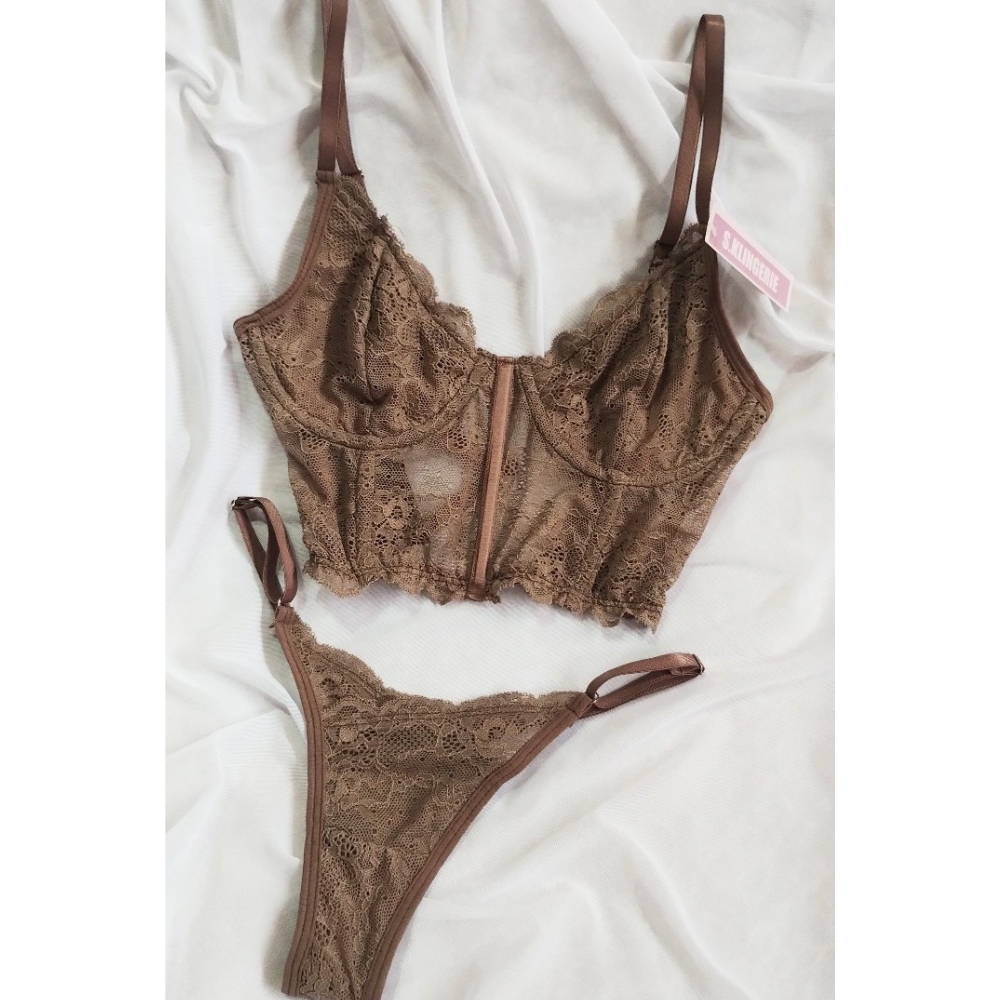 conjunto em renda com cropped com forro, com aro, com barbatanas e elásticos reguláveis, calcinha trançada regulável.